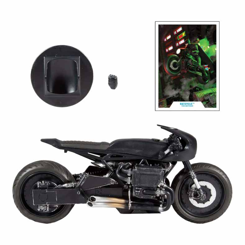 Based on the vehicle seen in The Batman movie, this 9 1/2-inch long x 4-inch tall Batcycle is featured with rotating wheels and turning handlebars. When the Batcycle is not out patrolling the streets of Gotham, it can be displayed with the included display base. Also included is a collectible art card with vehicle photography on the front, and vehicle biography on the back.